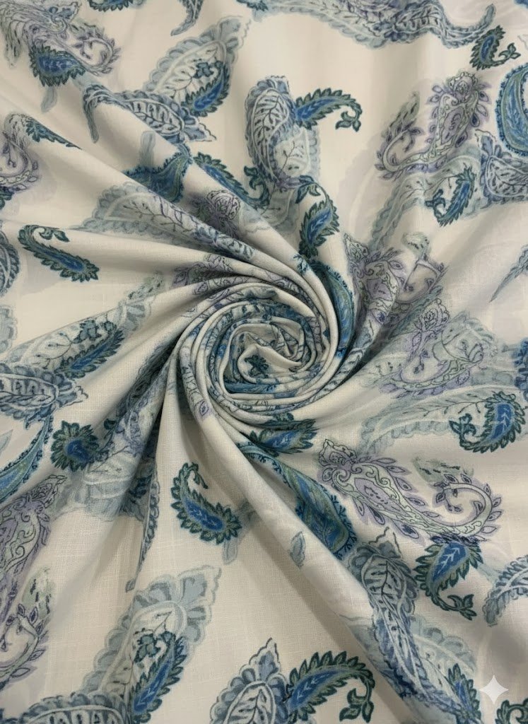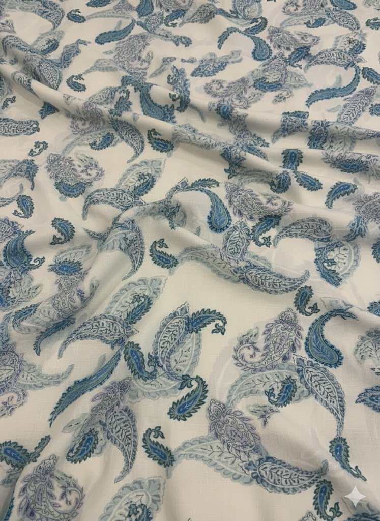 Raštuotas lininis audinys – tai natūralaus pluošto ir dekoratyvaus dizaino derinys, skirtas lengviems, estetiškiems ir patogiems drabužiams. Šis raštuotas lininis audinys pagamintas Italijoje iš 100 % lino ir pasižymi subtiliu paisley tipo raštu, kuris suteikia audiniui išskirtinumo, išlaikant natūralų lino charakterį.