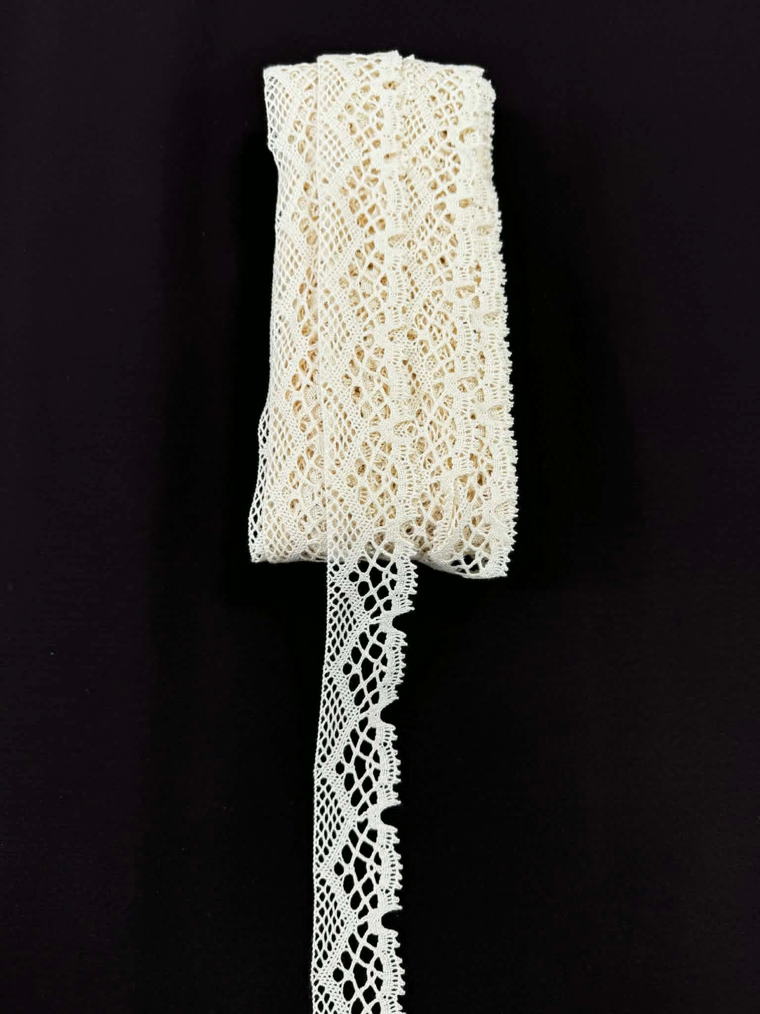 Nėrinių juostelė (Plotis 4cm) – balta smulkaus pynimo medvilninė.
