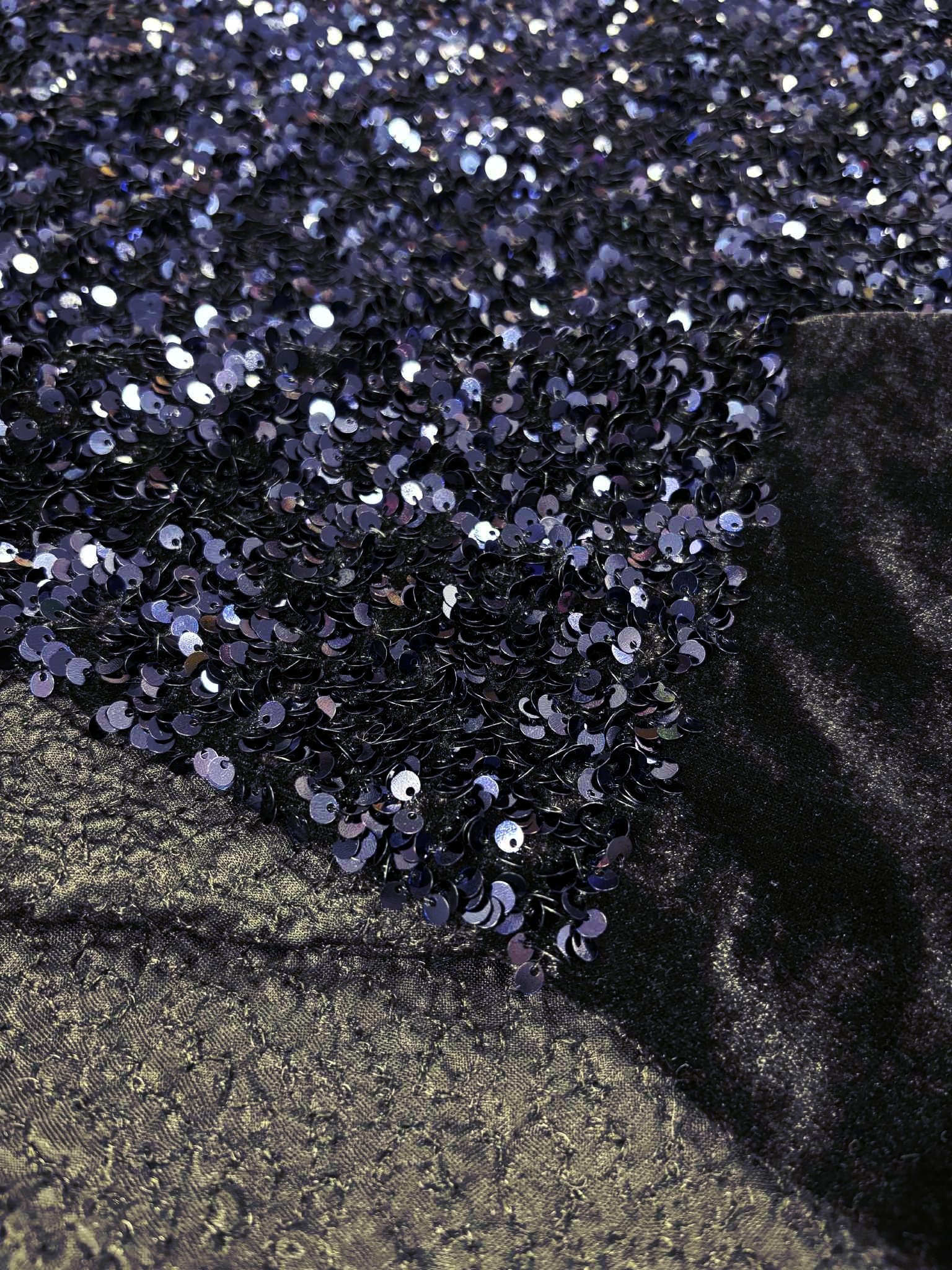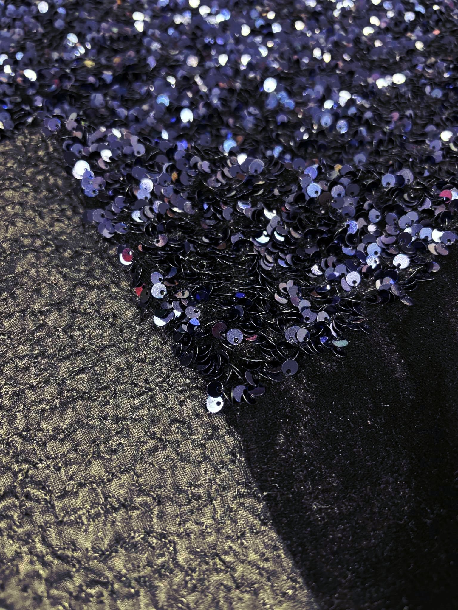 Tai vienpusis audinys, kurio geroji pusė yra išsiuvinėta karoliukais žvyneliais. Audinys yra ant plono veliūrinio pagrindo, todėl yra labai tamprus (tempiasi daug iš pločio, iš ilgio nedaug) ir nesunkus. Puikiai tinka įvairioms jūsų progoms ar rankdarbiams.