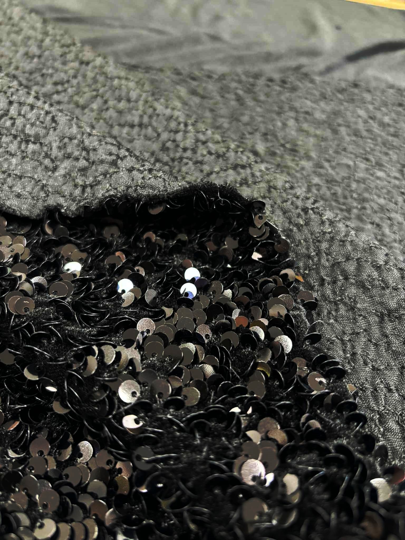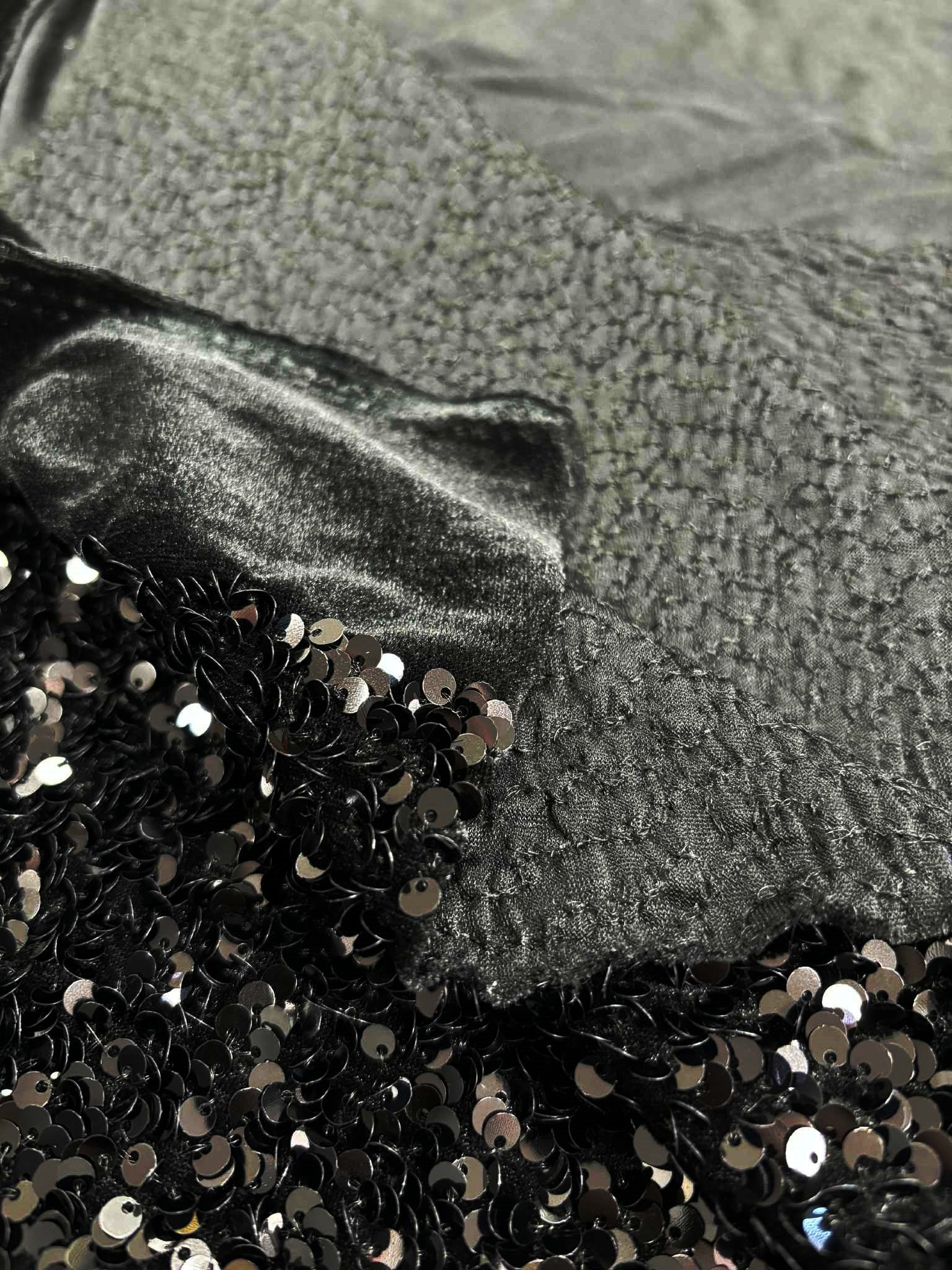 Tai vienpusis audinys, kurio geroji pusė yra išsiuvinėta karoliukais žvyneliais. Audinys yra ant plono veliūrinio pagrindo, todėl yra labai tamprus (tempiasi daug iš pločio, iš ilgio nedaug) ir nesunkus. Puikiai tinka įvairioms jūsų progoms ar rankdarbiams.