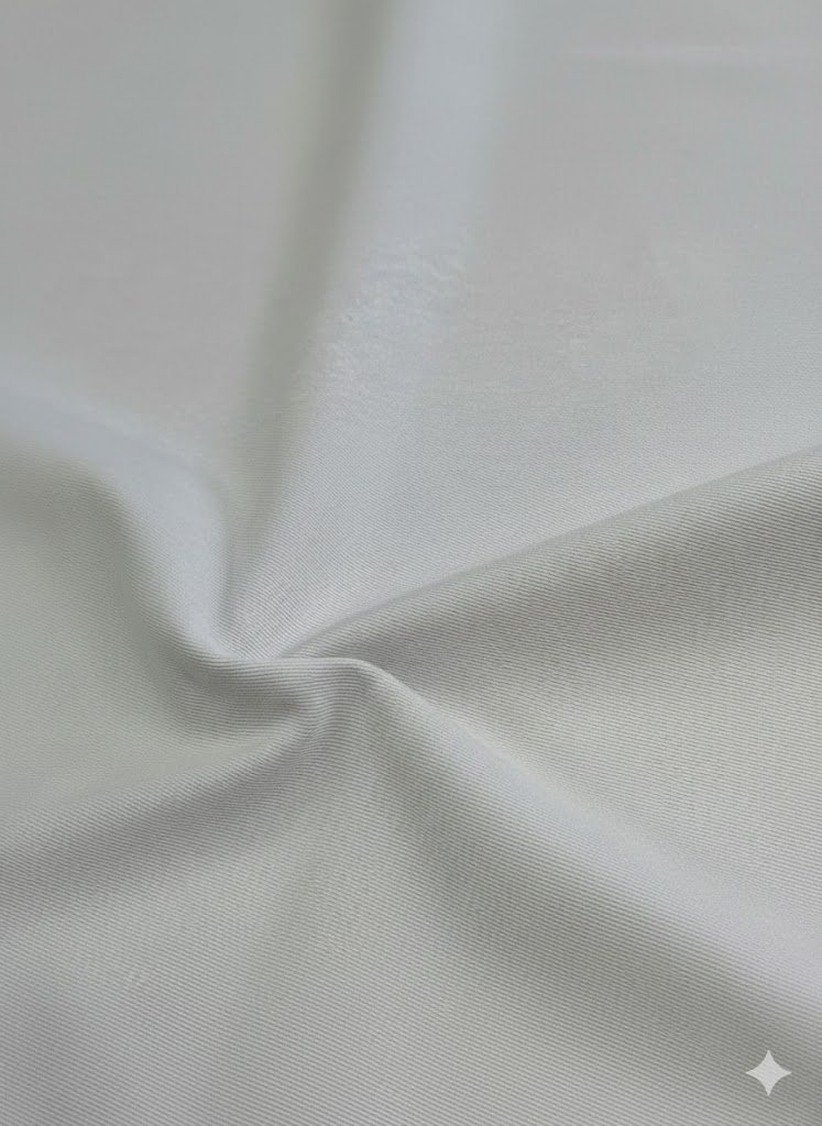 Baltas džinso audinys su elastanu plačiai naudojamas ir darbo ar uniforminiams drabužiams. Vidutinis kritimas suteikia tvarkingą siluetą, o tvirta struktūra užtikrina atsparumą dažnam dėvėjimui ir skalbimui. Tai praktiškas sprendimas, kai reikalingas patikimas, bet ne per standus audinys.