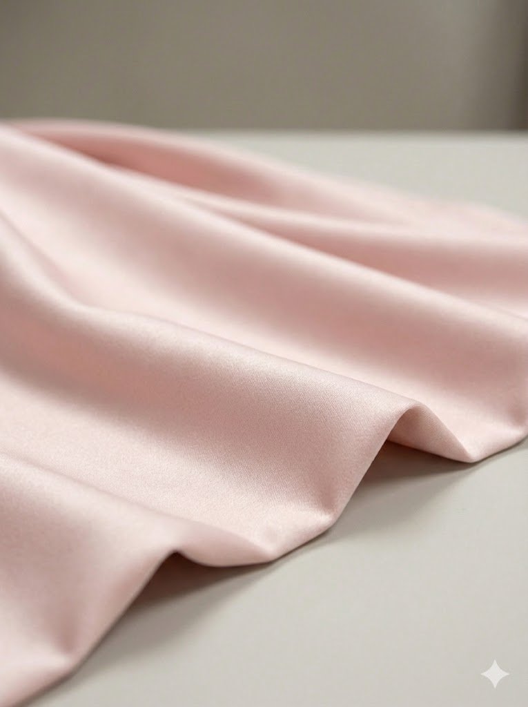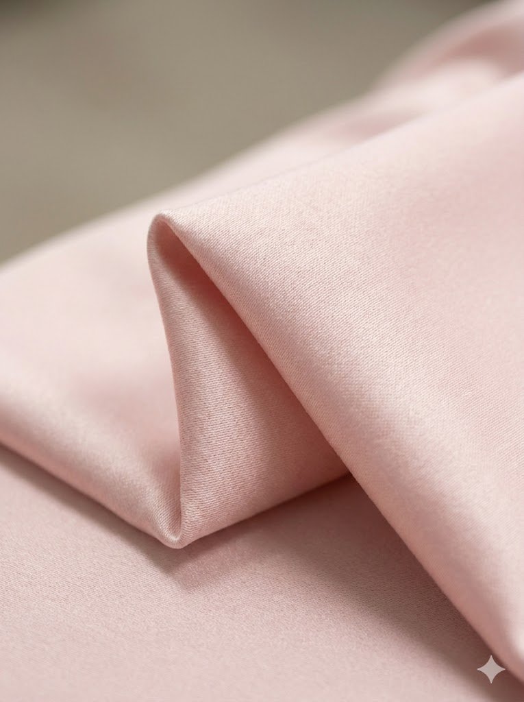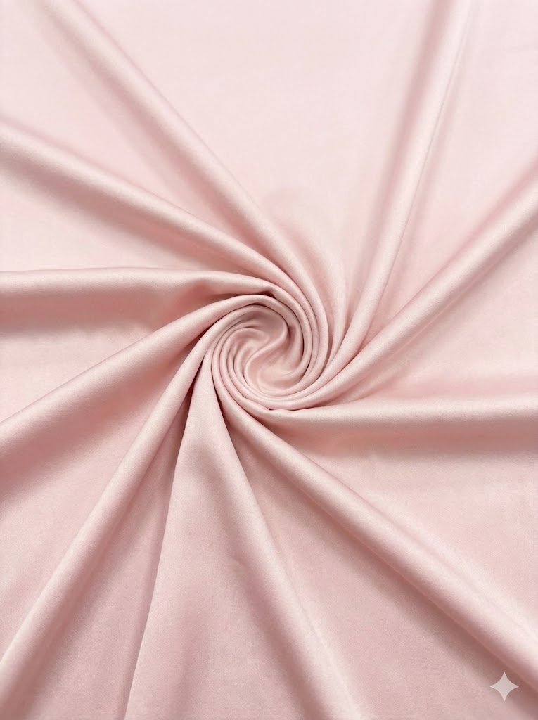 Blizgus atlasas su lygiu, švelniu paviršiumi ir subtiliu šviesios rožinės spalvos atspalviu. Audinys lengvai krinta, atrodo tvarkingai ir yra tinkamas elegantiškiems siuvimo sprendimams.