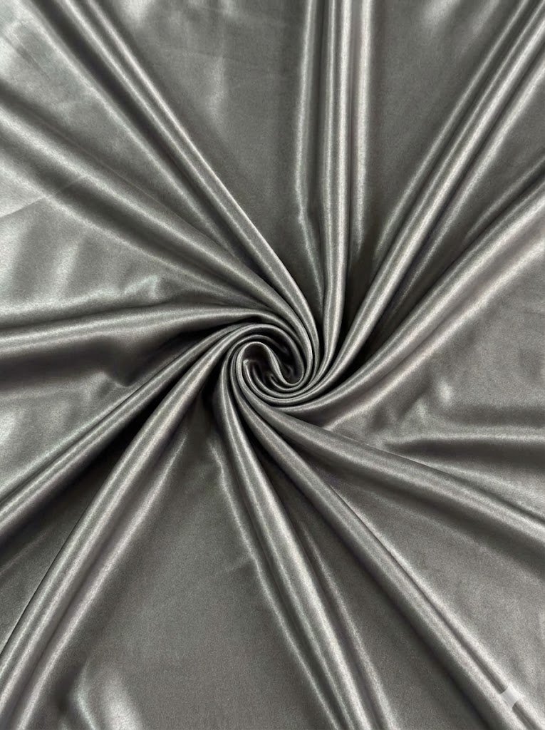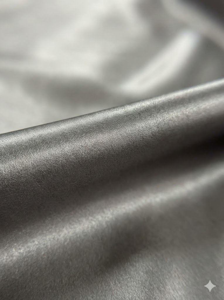 Atlasinis audinys su poliesterio ir elastano sudėtimi, pasižymintis švaria sidabrine–šviesiai pilka spalva ir tolygiu, subtiliu blizgesiu. Audinys minkštas, švelnus liesti, lengvai krintantis ir nedaug elastingas, todėl patogus formuoti bei siūti tikslių linijų gaminius. Neutralus metalinis atspalvis suteikia modernų ir tvarkingą vizualinį efektą.
