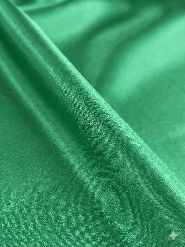 Atlasinis audinys su poliesterio ir elastano sudėtimi, pasižymintis sodria žalia spalva ir švelniu, tolygiu blizgesiu. Audinys minkštas, lengvai krintantis, subtiliai elastingas, patogus siuvant ir formuojant drapiruotes. Ryškus, bet subalansuotas atspalvis suteikia audiniui išraiškingumo ir aiškios struktūros.