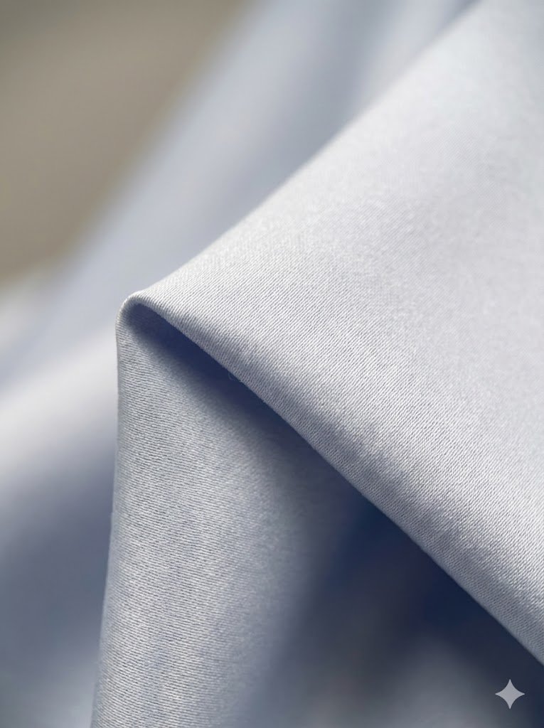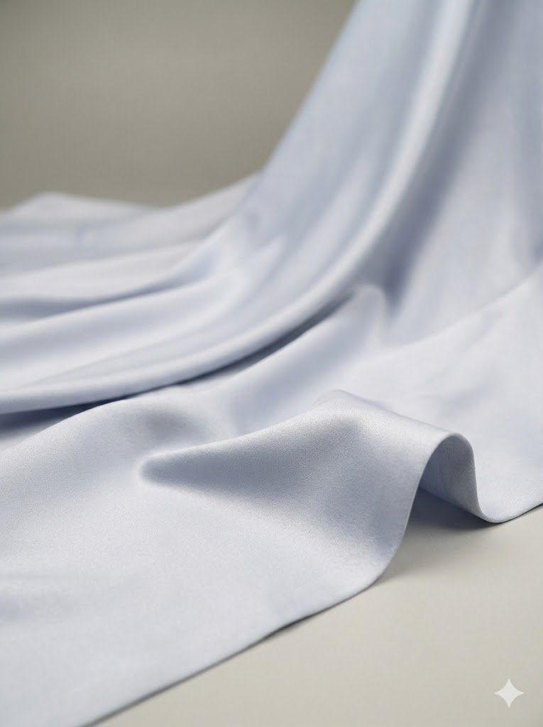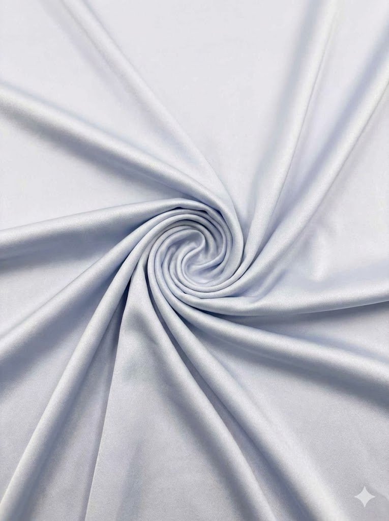 Lygus, švelnus audinys su lengvu kritimu ir švariu žydros spalvos atspalviu. Dėl poliesterio ir elastano sudėties audinys turi nedidelį elastingumą, yra praktiškas ir tinkamas kasdieniam bei proginiam naudojimui.