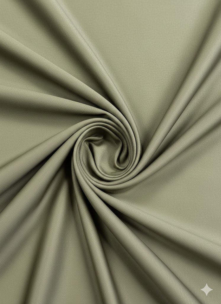 Šviesiai žalios (chaki) spalvos džinso audinys – vidutinio storio, tvirtas ir elastingas audinys su subtiliu, natūraliu atspalviu. Audinys gerai laiko formą, yra patogus dėvėti ir tinkamas tiek kasdieniams, tiek funkciniams siuviniams. Spalva lengvai derinama su neutraliomis ir natūraliomis tekstilės paletėmis.