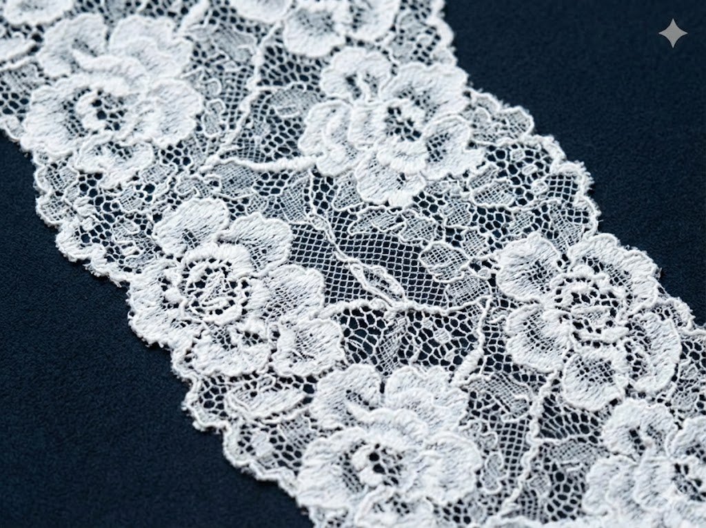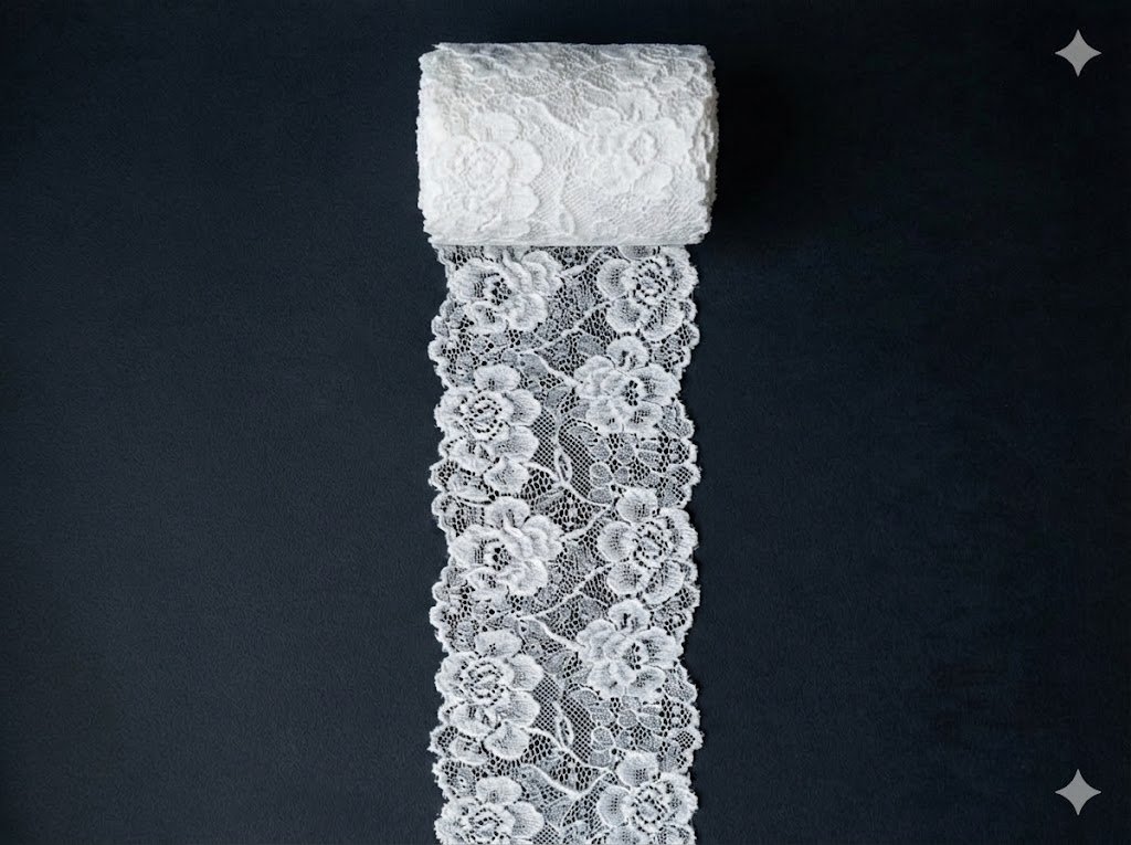 Plati elastinga nėrinių juosta su klasikiniu gėlių raštu, skirta drabužių ir tekstilės gaminių apdailai. Poliesterio ir elastano sudėtis suteikia juostai lankstumo, leidžia tolygiai priglusti ir išlaikyti formą. Tinka dekoratyvinei ir funkcinei apdailai įvairiuose siuvimo projektuose.