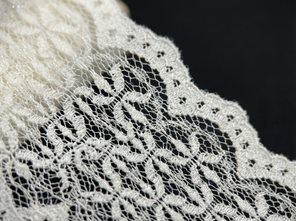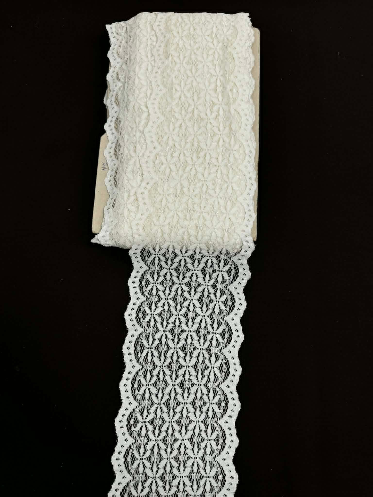 Geometrinis raštas suteikia gaminiui modernumo. Balta arba pieno atspalvio spalva leidžia lengvai derinti juostą su skirtingais audiniais. Todėl ši elastinga nėrinių juosta 14 cm pločio dažnai naudojama vestuvinių ir proginių drabužių detalėms.