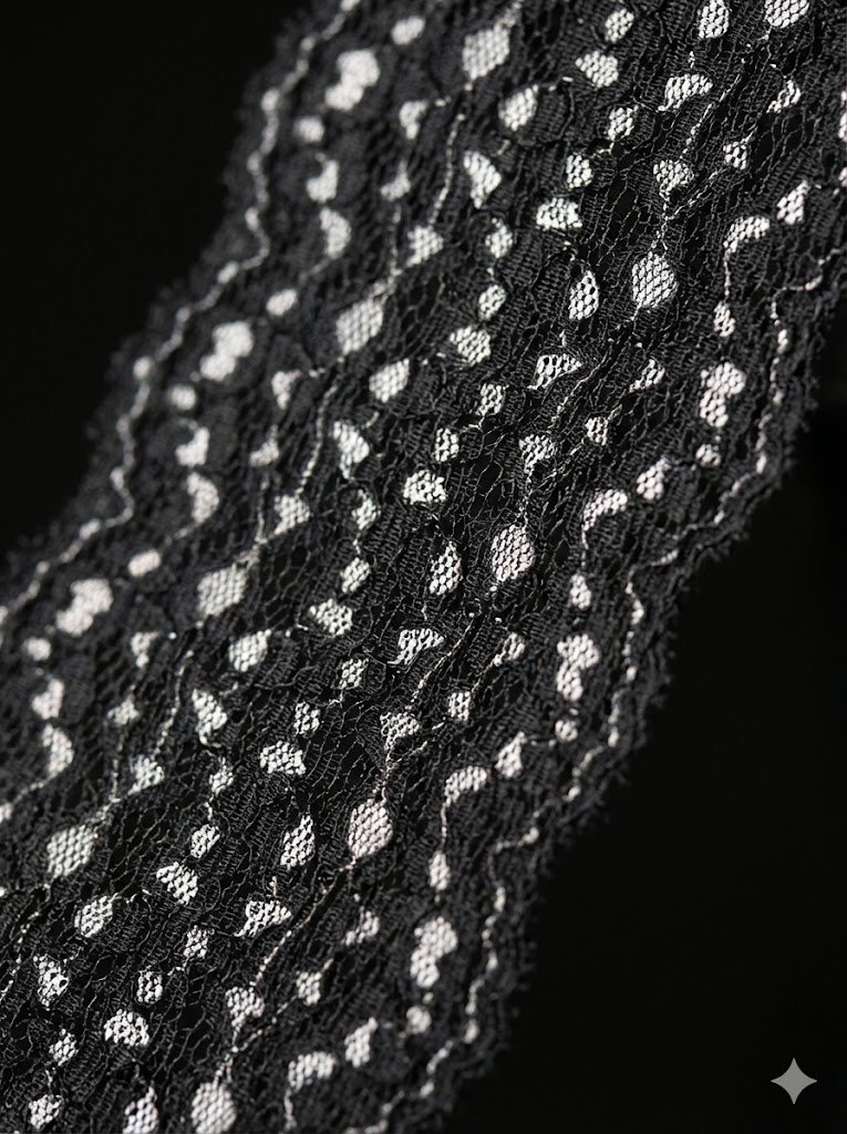 Kontrastinis smulkus raštas subtiliai išsiskiria šviesiais akcentais, kurie suteikia nėriniams gylio ir tekstūros. Juoda spalva leidžia lengvai derinti šią juostą su įvairiais audiniais – nuo permatomų tiulių iki tankesnių trikotažinių ar satino medžiagų. Dėl to ji dažnai naudojama apatiniam trikotažui, naktiniams drabužiams, taip pat proginiams ir sceniniams kostiumams.
