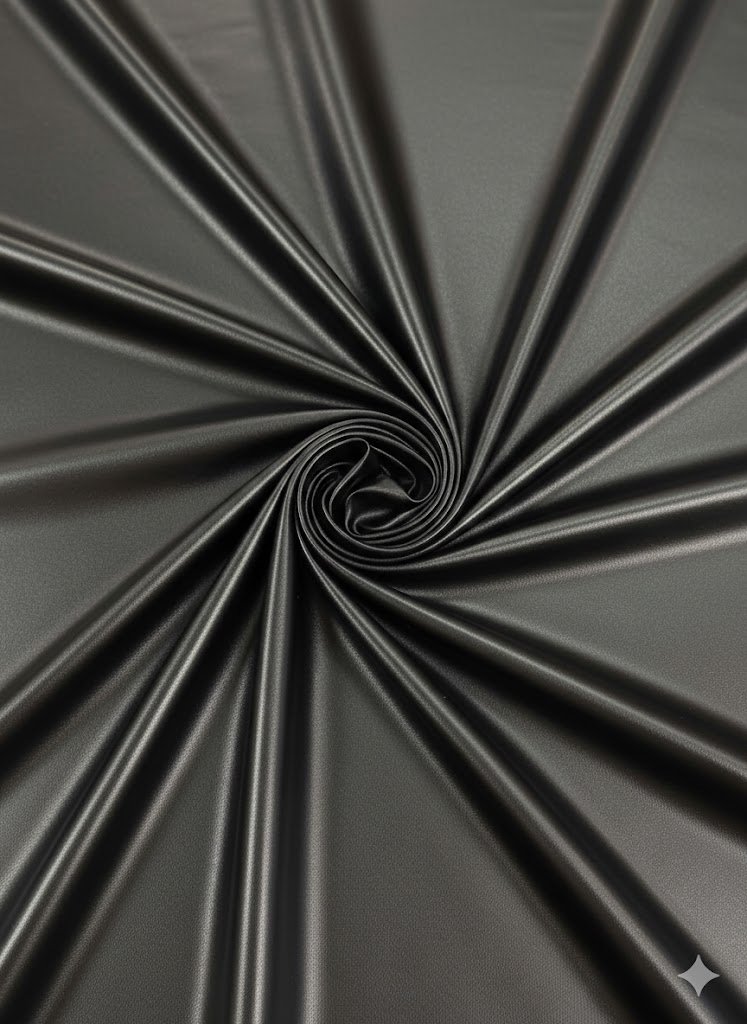 Dirbtinė oda su lygesne tekstūra ir blizgiu paviršiumi, juodos spalvos. Elastinga medžiaga, gerai prisitaikanti prie formų, tinkama siuvimo darbams, kur reikalingas vizualiai ryškesnis efektas ir patogus dėvėjimas.