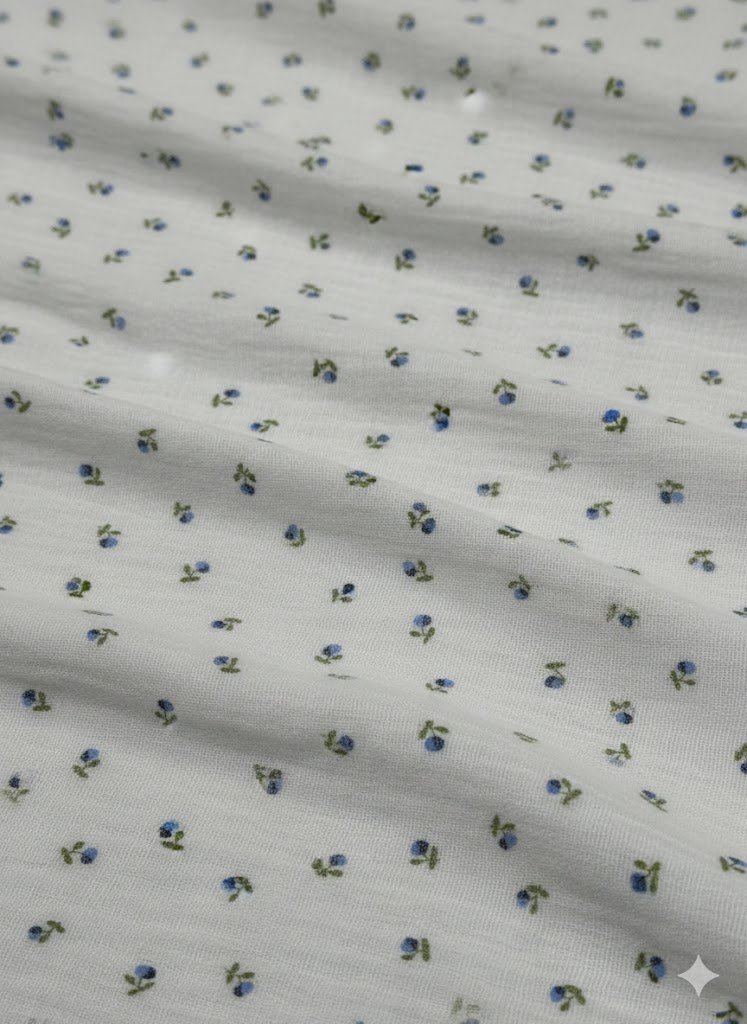 Medvilninis muslinas su gėlytėmis – tai natūralus, lengvas ir ypač komfortiškas audinys, skirtas siuvimo projektams, kuriuose svarbus minkštumas, oro pralaidumas ir subtilus dekoras. Audinys pagamintas iš 100 % medvilnės ir yra muslino tipo, dar vadinamas dviguba marle, pasižymintis natūraliai raukšlėta tekstūra.