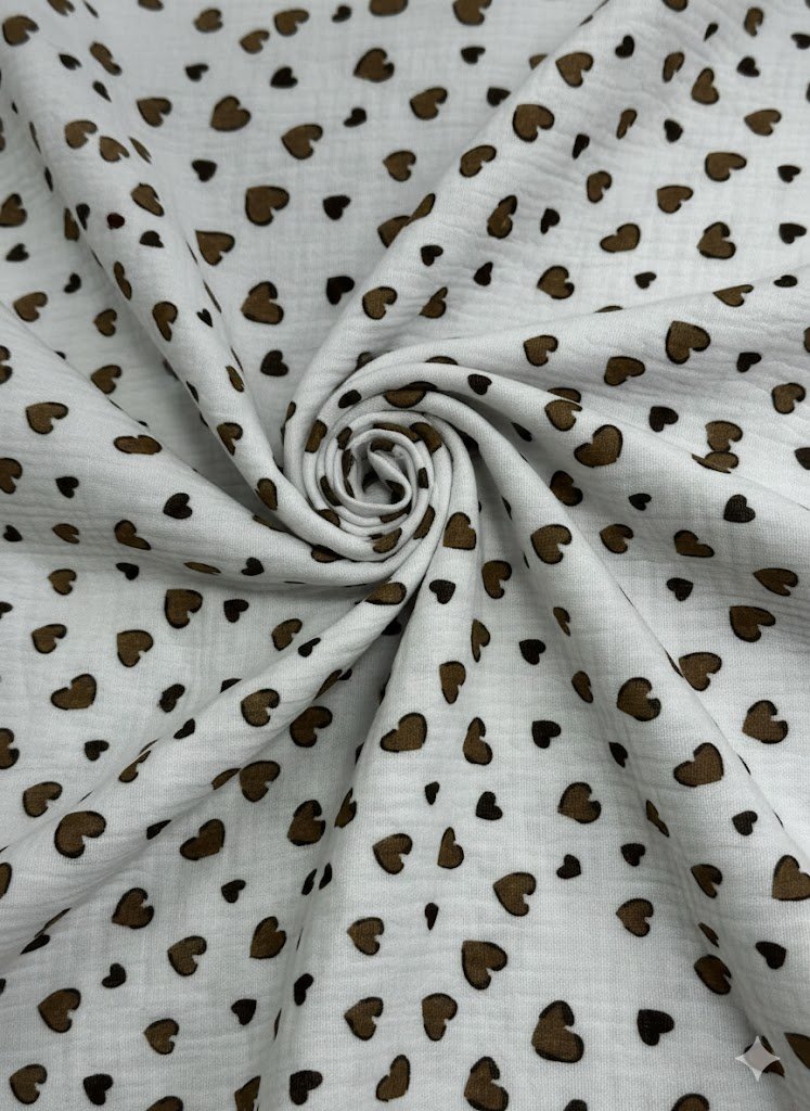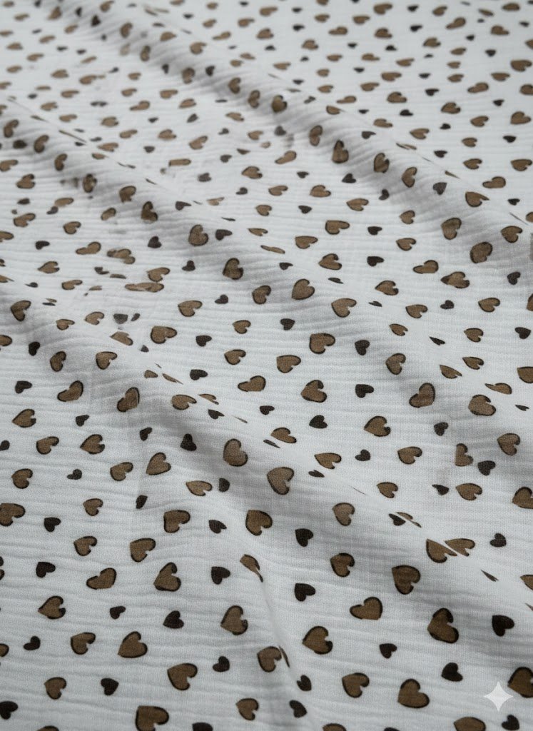 Smulkus širdelių raštas sukuria švelnų, estetiškai neutralų dizainą, tinkantį tiek mergaitėms, tiek berniukams. Balto pagrindo ir rudo rašto derinys atrodo subtiliai, lengvai pritaikomas įvairiuose vaikiškos tekstilės projektuose. Dėl to audinys dažnai pasirenkamas kūdikių drabužiams, vystyklams, pledukams ir lengviems užklotėliams.
