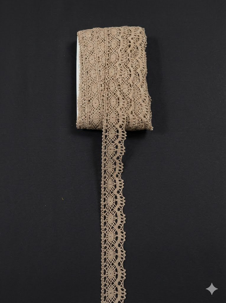 Ši nėrinių juostelė pagaminta iš 100 % natūralios medvilnės, todėl pasižymi geru laidumu orui, malonia tekstūra ir patogiu apdirbimu. Medvilninė sudėtis leidžia juostelę lengvai siūti tiek rankiniu būdu, tiek siuvimo mašina, išlaikant tvarkingą kraštą ir stabilų ažūrinį raštą.