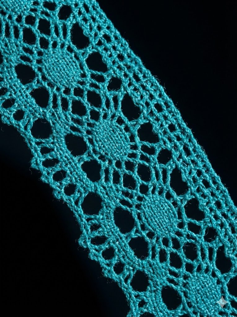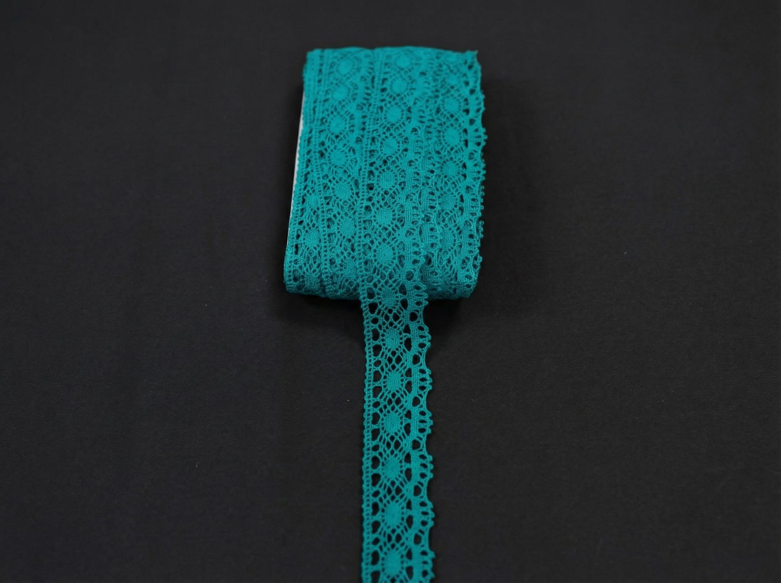 Nėrinių juostelė, 4,8 cm pločio, skirta dekoratyvinei tekstilės apdailai. Ažūrinio rašto su ritmiškai pasikartojančiais ovaliniais motyvais, sodrios turkio spalvos. Pagaminta iš natūralios medvilnės, suteikia gaminiams išraiškingą, bet tvarkingą dekoratyvinį akcentą. Tinka interjero tekstilei ir įvairiems siuvimo sprendimams.