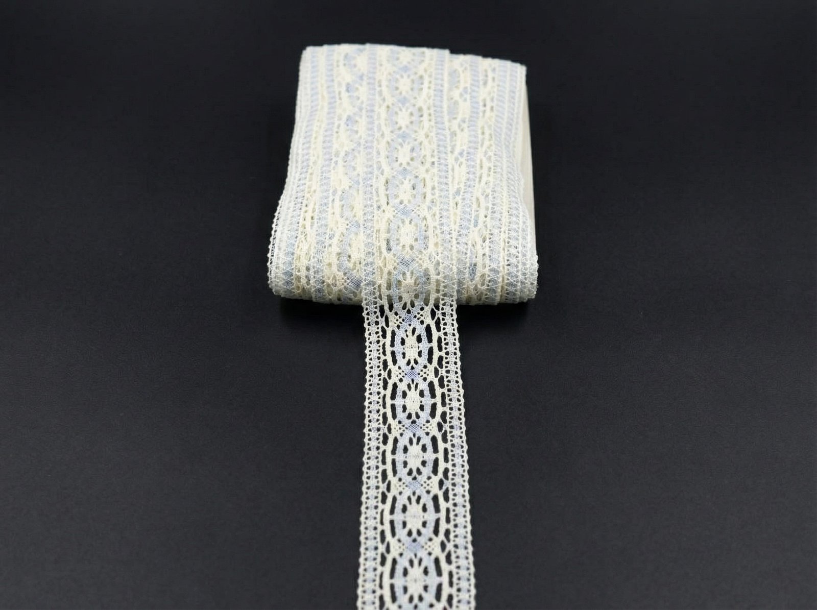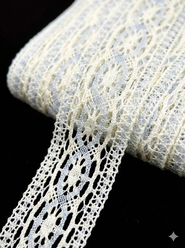 Nėrinių juostelė, 5 cm pločio, skirta dekoratyvinei tekstilės apdailai. Smulkaus ažūrinio rašto, pagaminta iš natūralios medvilnės, suteikia gaminiams lengvą, šviesų ir tvarkingą apdailos vaizdą. Tinka klasikiniams ir subtiliems tekstilės sprendimams.