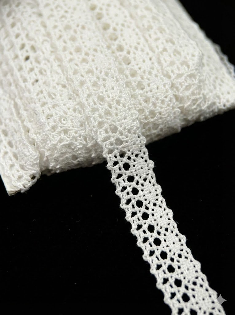 Nėrinių juostelė 2,5 cm pločio skirta subtiliai dekoratyvinei tekstilės apdailai, kai reikalingas lengvas, tvarkingas ir neutralus akcentas. Dėl siauro pločio ir smulkaus ažūrinio rašto ši juostelė idealiai tinka preciziškiems siuvimo darbams, kuriuose svarbus detalumas ir švara.