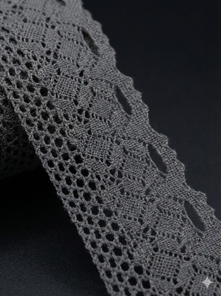 Nėrinių juostelė, 6,5 cm pločio, skirta dekoratyvinei tekstilės apdailai. Ažūrinio, geometrinio rašto su subtiliu krašteliu, suteikia gaminiams modernų, santūrų ir elegantišką akcentą. Pagaminta iš natūralios medvilnės, puikiai tinka tiek interjero tekstilei, tiek drabužių apdailai.