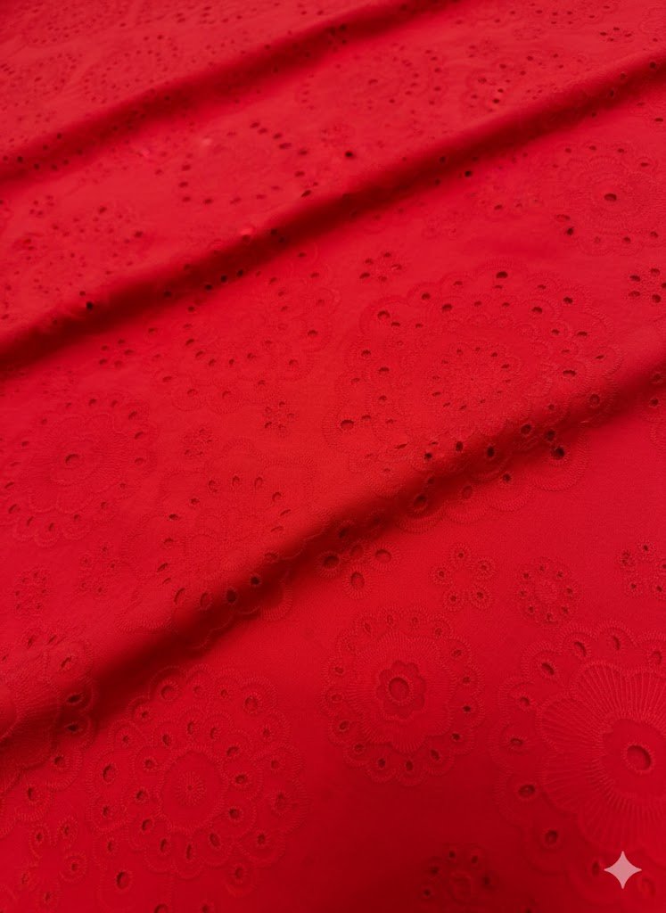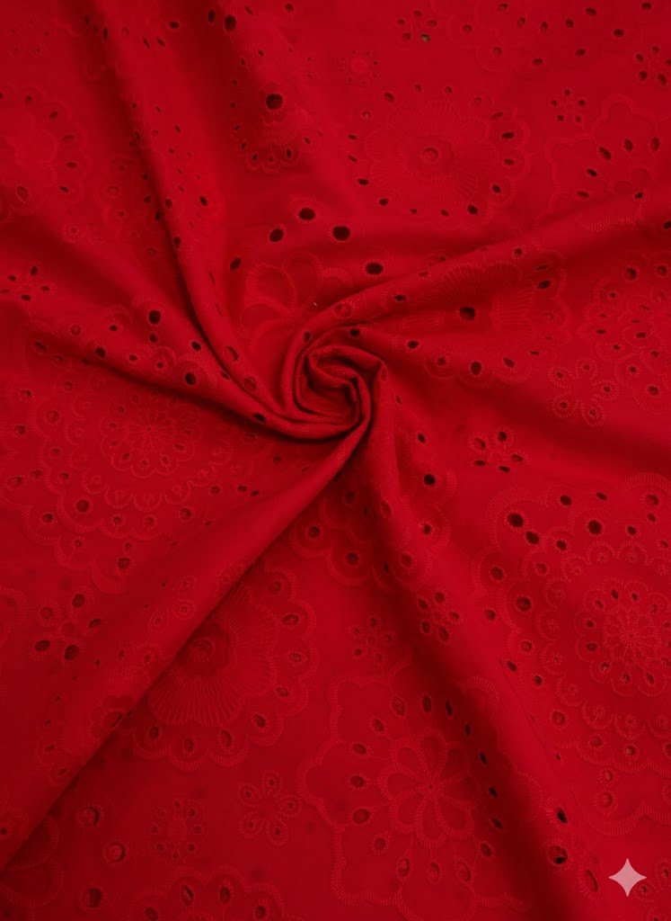 Raudonas medvilninis ažūrinis audinys – tai natūralus, dekoratyvus ir funkcionalus pasirinkimas siuvimo projektams, kuriuose svarbus komfortas, oro pralaidumas ir vizualinis lengvumas. Audinys pagamintas iš 100 % medvilnės, todėl yra kvėpuojantis, malonus liesti ir tinkamas dėvėti tiesiogiai ant odos.