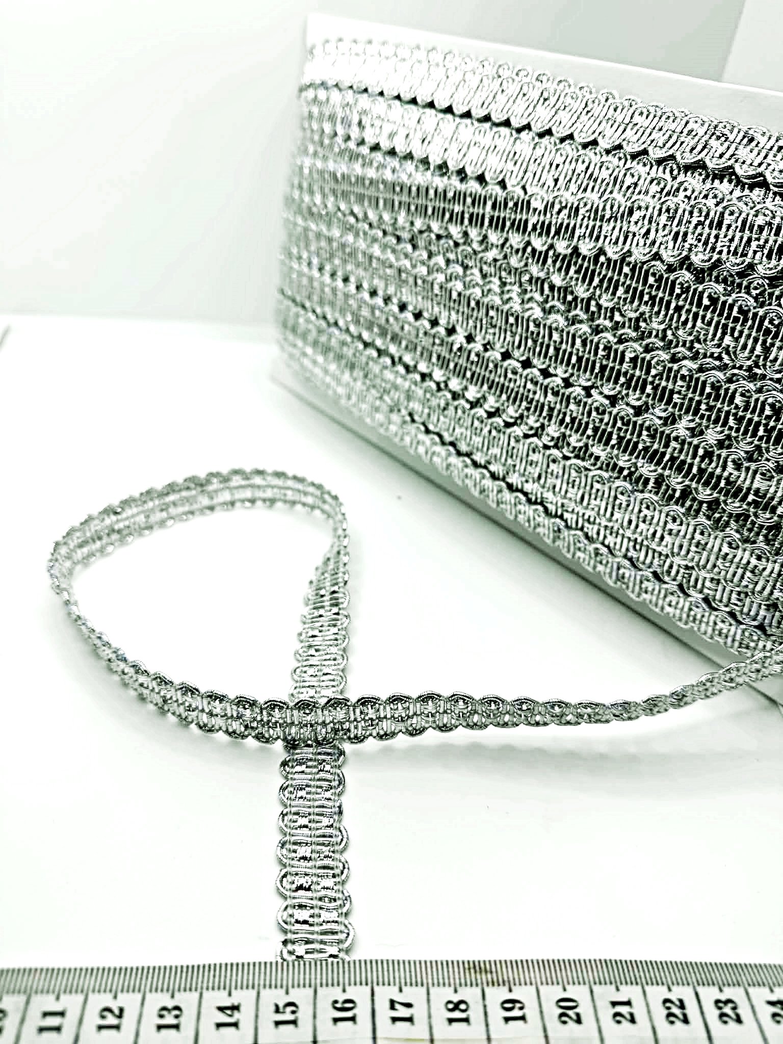 Sidabro spalvos siaura juostelė, puikiai tinkanti įvairioms dekoracijoms, papuošimams, rankdarbiams ir t.t.