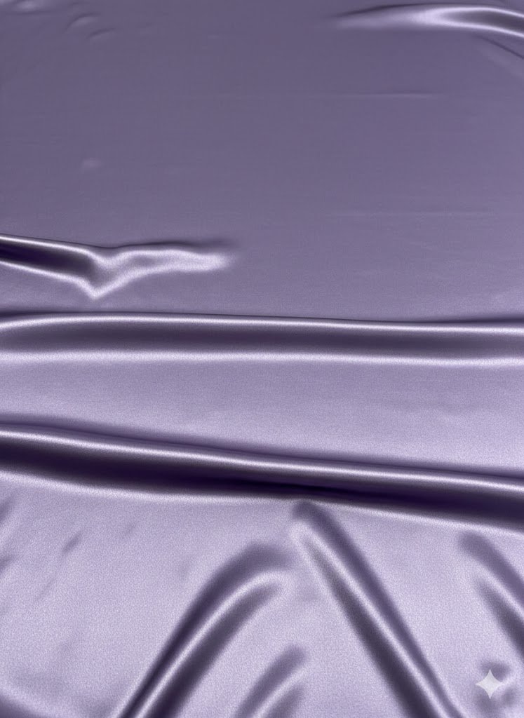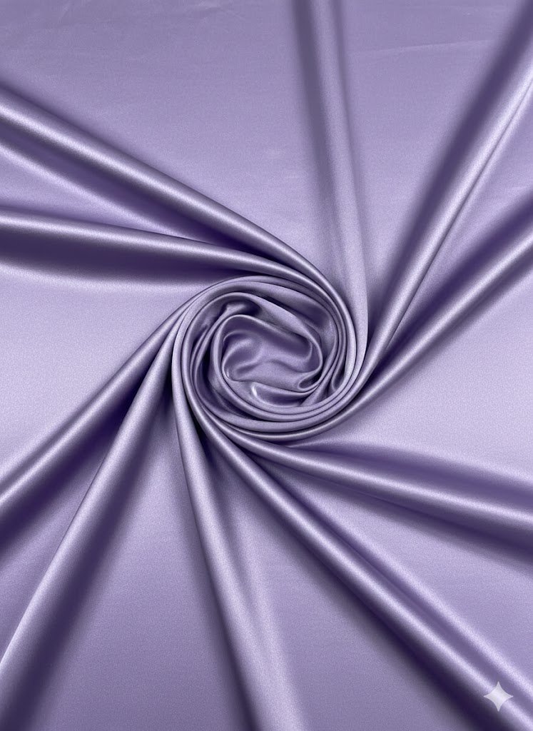 Natūralus šilko audinys su elastanu, pasižymintis lygiu paviršiumi, švelniu šilko blizgesiu ir elegantišku, tolygiu kritimu. Lengvas tamprumas suteikia papildomo komforto ir leidžia audiniui tiksliai prisitaikyti prie silueto. Spalva – šviesiai violetinė (alyvinė). Pagaminta Italijoje.