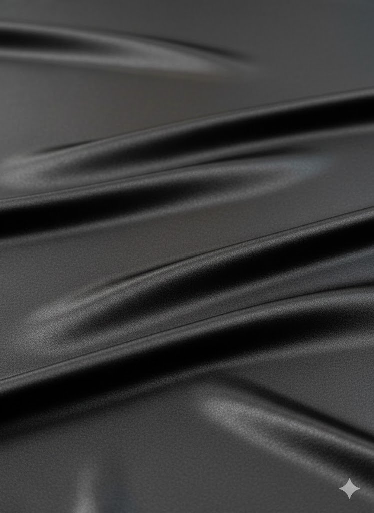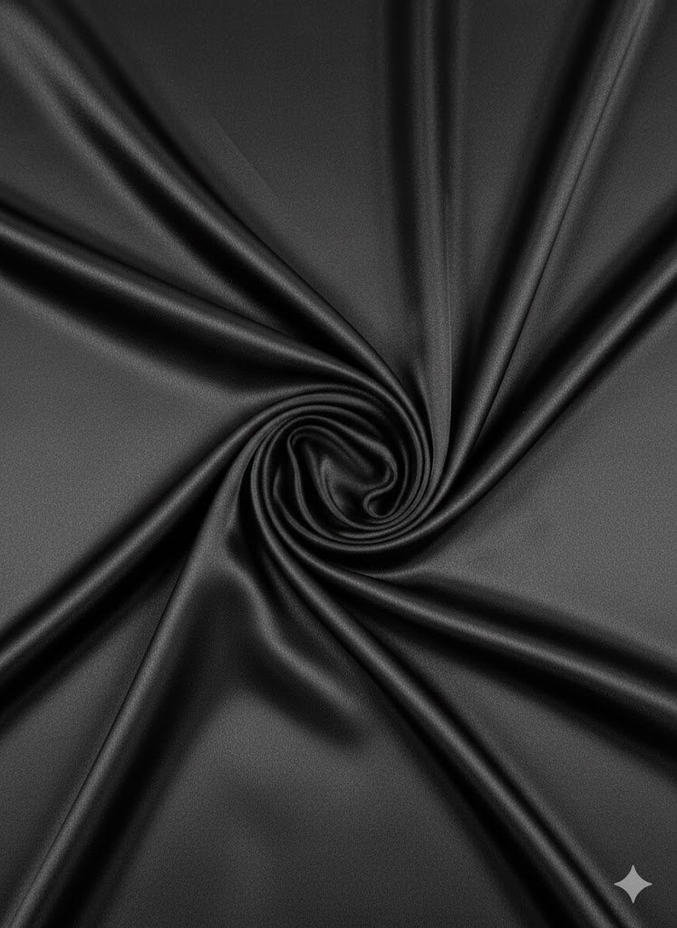 Natūralus šilko audinys su elastanu, pasižymintis lygiu paviršiumi, subtiliu blizgesiu ir sklandžiu, tolygiu kritimu. Lengvas tamprumas suteikia papildomo komforto ir leidžia audiniui išlaikyti elegantišką siluetą. Spalva – juoda. Pagaminta Italijoje.