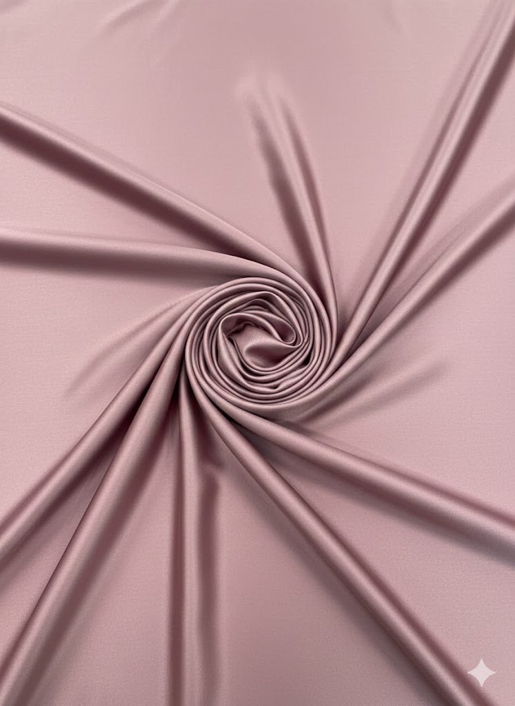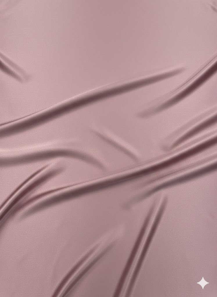 Natūralus šilko audinys su elastanu, pasižymintis lygiu paviršiumi, subtiliu šilko blizgesiu ir minkštu, tolygiu kritimu. Lengvas tamprumas suteikia komforto ir leidžia audiniui estetiškai prisitaikyti prie silueto. Spalva – pelenų rožinė. Pagaminta Italijoje.