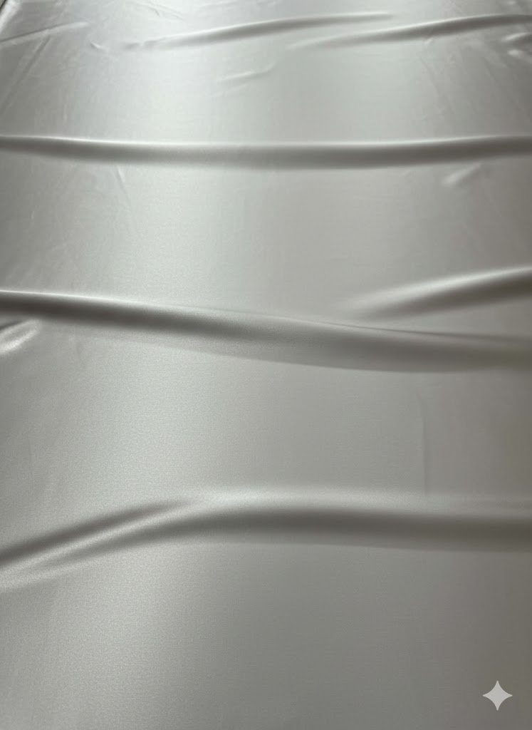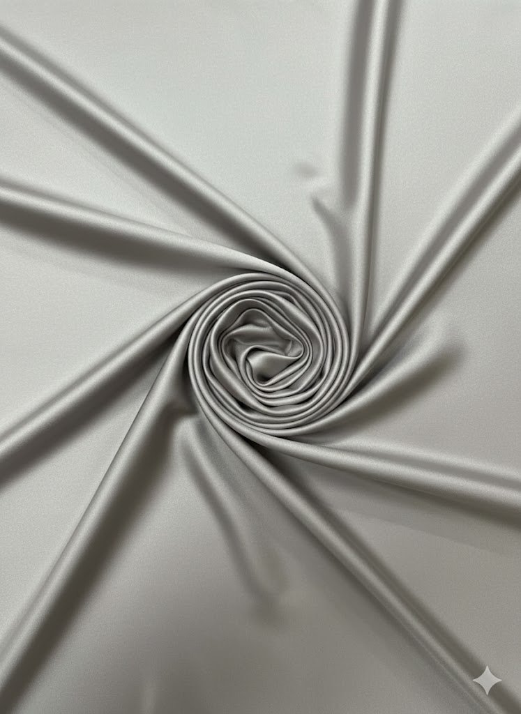 Natūralus šilko audinys su elastanu, pasižymintis lygiu paviršiumi, subtiliu šilko blizgesiu ir tolygiu, elegantišku kritimu. Lengvas tamprumas suteikia papildomo komforto ir leidžia audiniui gražiai prisitaikyti prie silueto. Spalva – šviesiai pilka (sidabrinio tono). Pagaminta Italijoje.