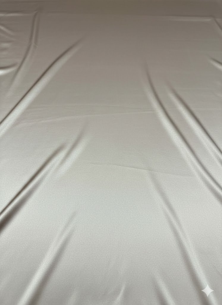 Šviesiai kakavinės spalvos šilko audinys su elastanu yra patikimas pasirinkimas vakarinei, proginei aprangai bei aukštos kokybės moteriškiems drabužiams, kai svarbus natūralumas, spalvos šiluma ir profesionalus rezultatas.