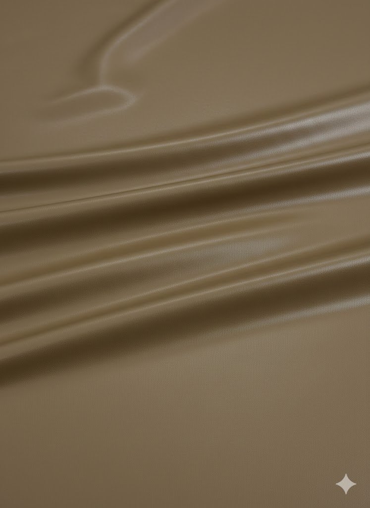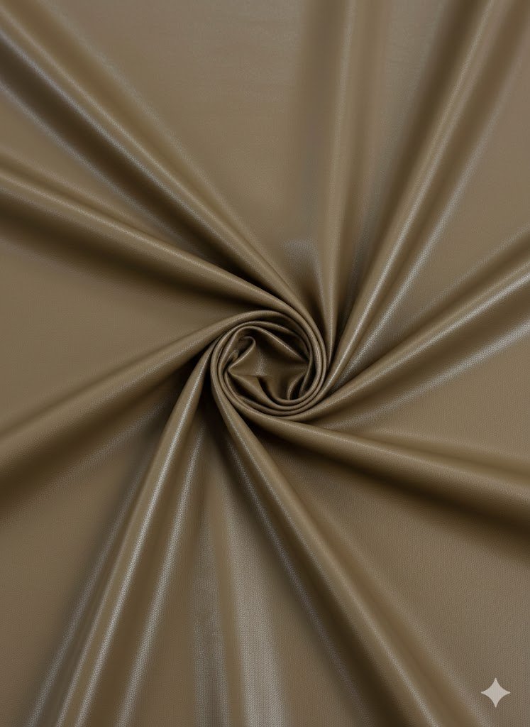 Dirbtinė oda su lygiu paviršiumi, šiltos smėlio–rudos spalvos. Medžiaga elastinga, minkšta, gerai krintanti, tinkama siuvimo darbams, kur reikalingas tvarkingas vaizdas ir komfortiškas dėvėjimas.