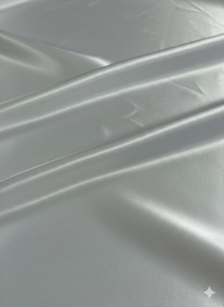 Storas atlasas pieno spalvos atspalvio su lygiu paviršiumi ir švelniu, tolygiu blizgesiu. Audinys yra tankus, neelastingas, gerai laikantis formą ir suteikiantis tvarkingą, solidų vaizdą siuviniams.