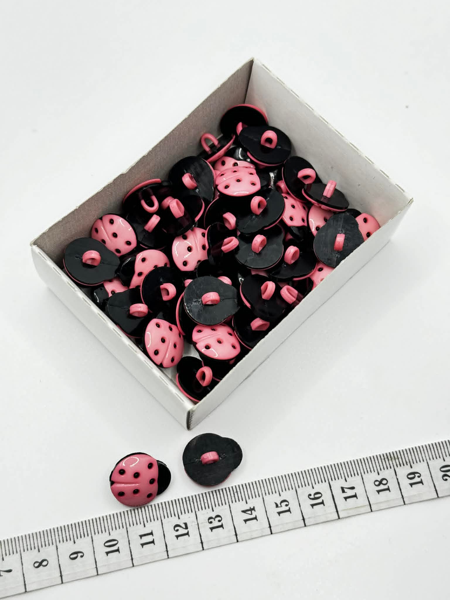Saga pagaminta iš plastiko – lengvos, patvarios ir priežiūros nereikalaujančios medžiagos. Plastikinės sagos dažnai pasirenkamos vaikų aprangoje dėl atsparumo dažnam skalbimui ir aktyviam dėvėjimui. Rožinės ir juodos spalvų derinys su aiškiu boružės motyvu sukuria kontrastingą, lengvai pastebimą dizainą, kuris tampa ne tik funkcine, bet ir dekoratyvia drabužio detale.