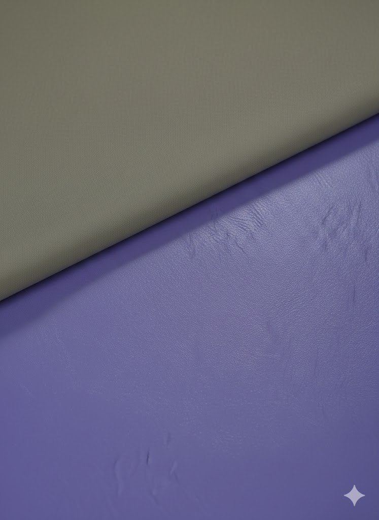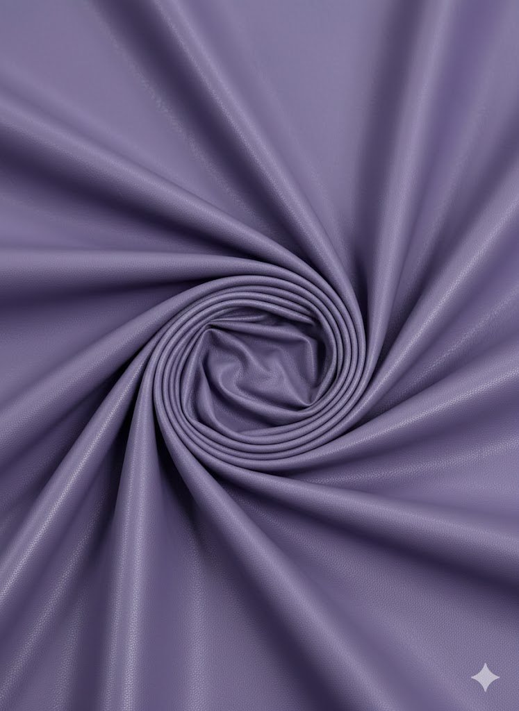 Dirbtinė oda su smulkia, tolygia tekstūra, violetinės (alyvinės) spalvos. Medžiaga elastinga, minkšta, gerai krintanti, tinkama siuvimo darbams, kur reikalingas švarus paviršius ir komfortiškas dėvėjimas.