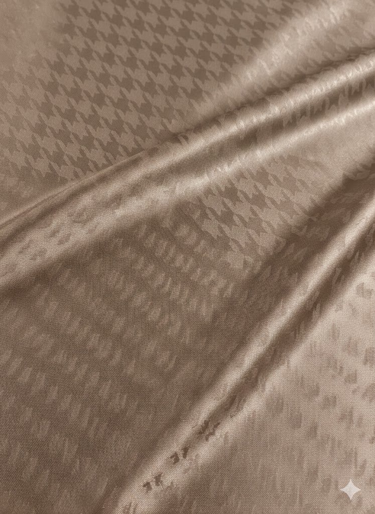 Viskozės pamušalas smėlio – lengvas ir švelnus pasirinkimas kokybiškam drabužių vidiniam apdailinimui. Pagamintas iš 100 % viskozės, šis pamušalas pasižymi geru slydimu, natūraliu kritimu ir komfortišku dėvėjimu. Subtilus įaustas geometrinis raštas suteikia medžiagai išskirtinumo, išlaikant profesionalų ir santūrų vaizdą.